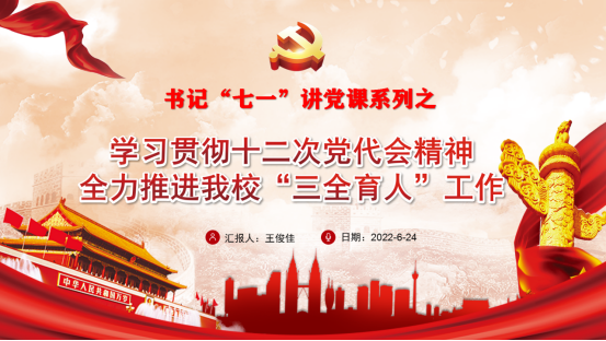 为迎接建党101周年,根据省委教育工委关于开展书记“七一”讲党课相关要求,近日,im体育&电子足球党委书记王俊佳围绕以《学习贯彻十二次党代会精神,全力推进我校“三全育人”工作》为题,为全体党委委员、纪委委员、各党总支书记、支部书记和部分师生党员120余人上了一堂生动地党课,进一步提升了党员干部政治思想和政治觉悟,增强责任感和使命感,激发基层党支部与广大共产党员和全体教职工坚定信念、奋发有为。