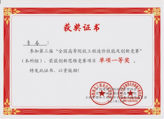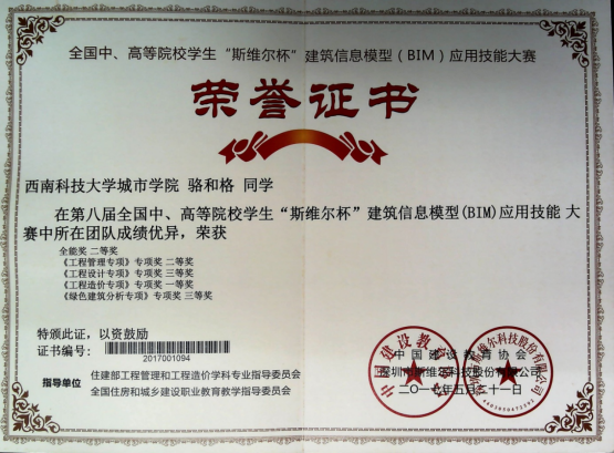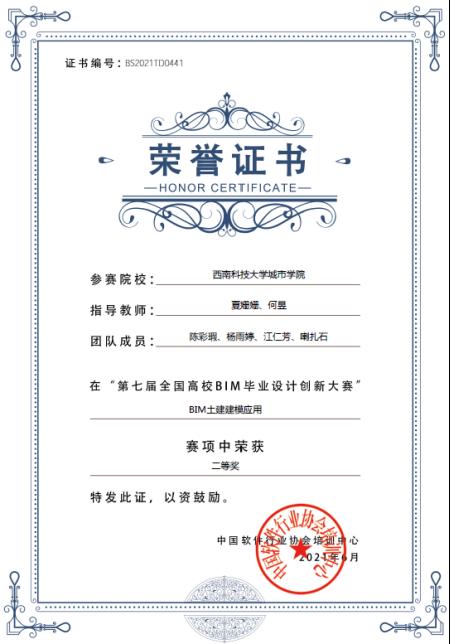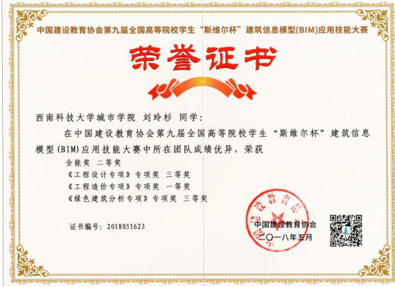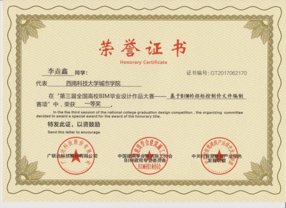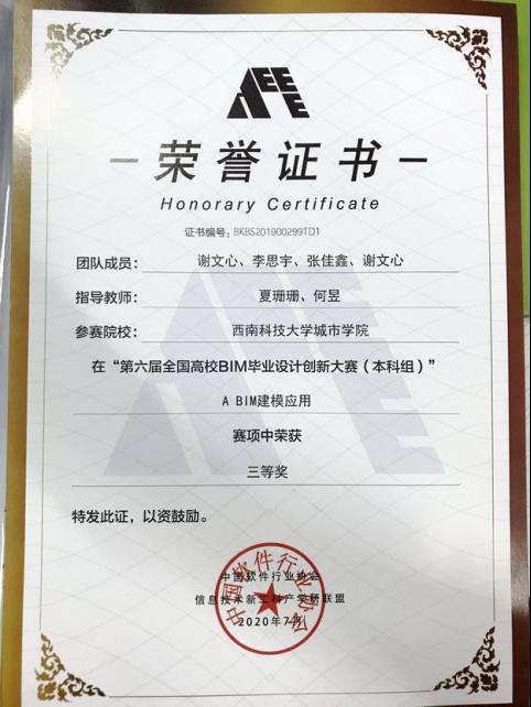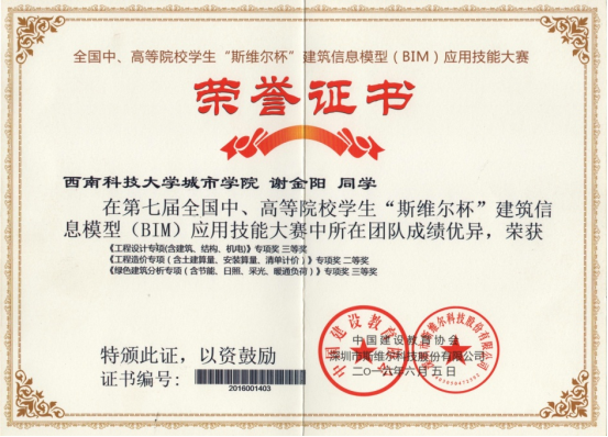 为切实提高学生人才培育质量,本专业积极组织师生参加各类专业学科竞赛,形成了以赛代训的教学模式,以提升学生对所学知识的综合运用能力。其中固定参加的比赛包括:参加全国高等院校学生“斯维尔杯”BIM-CIM创新大赛(全国高校“斯维尔杯”BIM应用技能大赛)并获得一等奖5项、二等奖6项、三等奖5项;参加全国高校BIM毕业设计大赛并获得一等奖2项、二等奖3项,三等奖4项;参加四川省大学生BIM建模竞赛获得二等奖1项、三等奖1项;还有参加的各类线上比赛,均获得优异成绩。近五年来,获奖超过260人次。