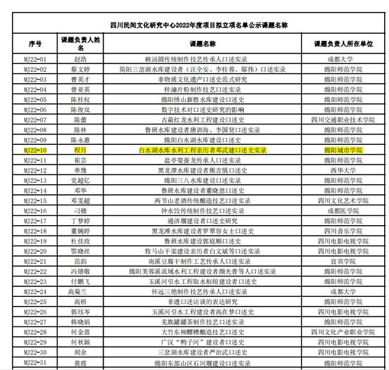 近日,学校收到四川省民间文化研究中心2022年立项文件,艺术与设计学院程月老师申报的《白水湖水库水利工程亲历者邓武建口述史实录》项目经专家评审获批立项。