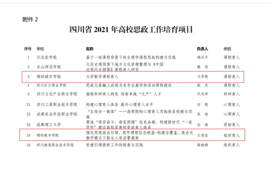 近日,四川省委教育工委下发《中共四川省委教育工作委员会关于公布第二批全省高校思想政治工作精品项目评选结果的通知》(以下简称《通知》),经各高校申报、专家组评审、教育工委审定,遴选产生第二批精品项目67项、培育项目25项(名单见附件)。精品项目建设周期为两年,自2021年12月至2023年12月。我校《大学数学课程育人》和《强化思想政治引领,筑牢理想信念根基-构建全覆盖,混合式教学模式下新生入党启蒙教育》成功入选高校思政工作培育项目。